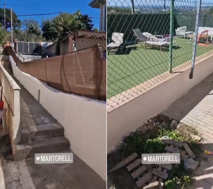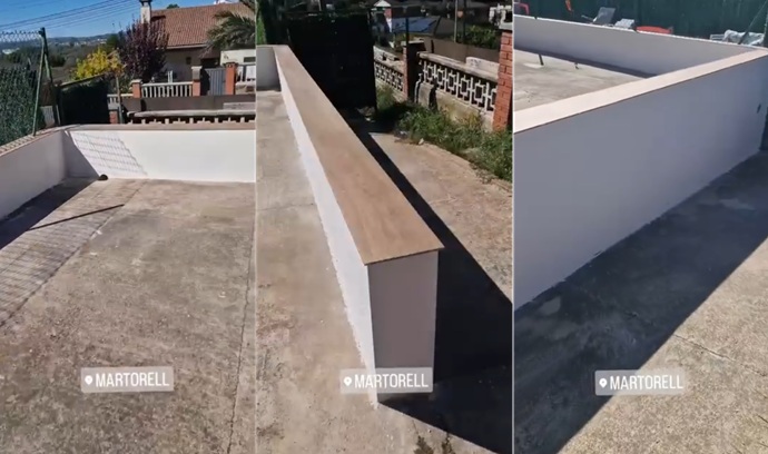 El resultado es un muro perimetral rehabilitado en Martorell con acabado monocapa blanco y vierteaguas cerámico en imitación madera de alta calidad.